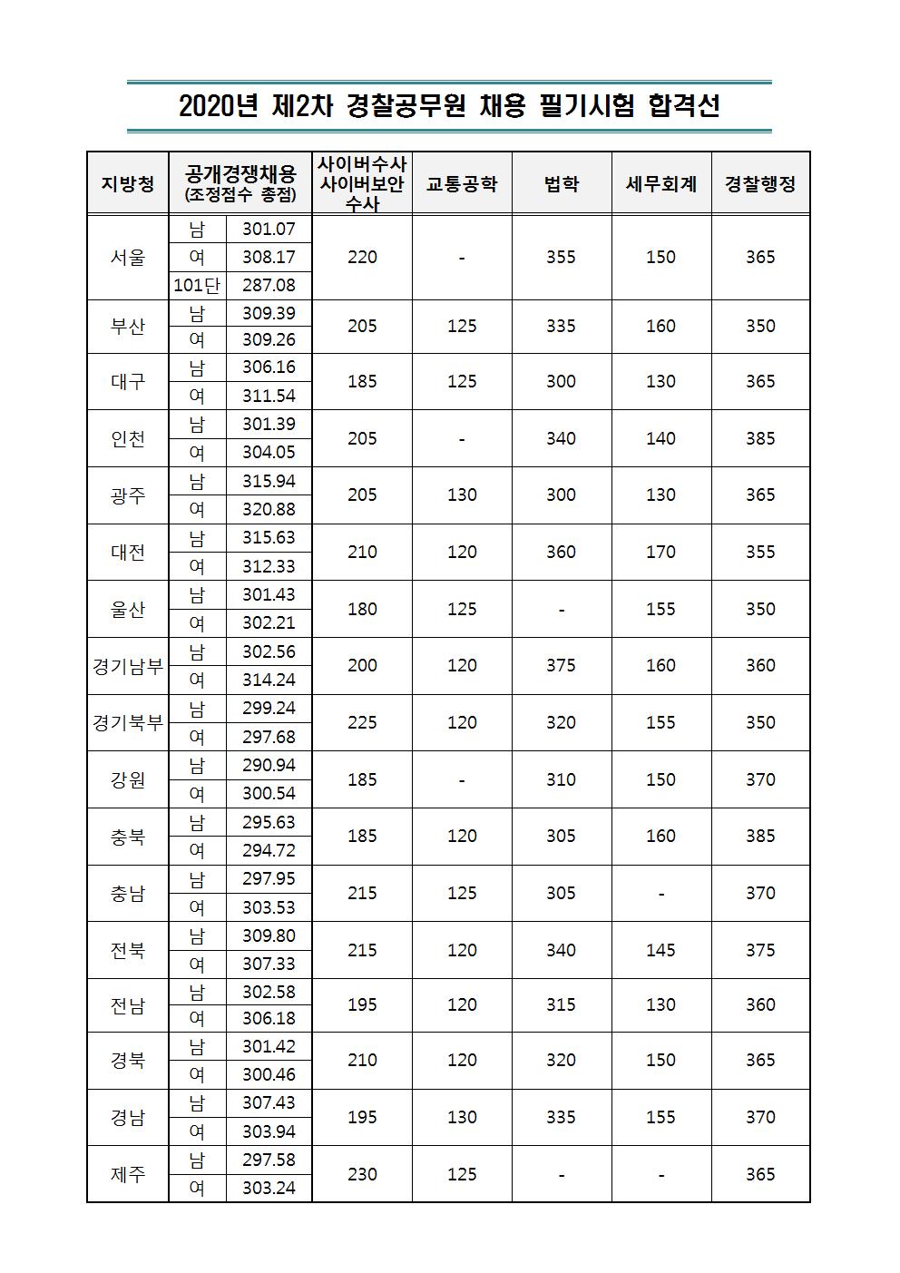 글제목 :      2020년 2차 경찰공무원 필기합격선