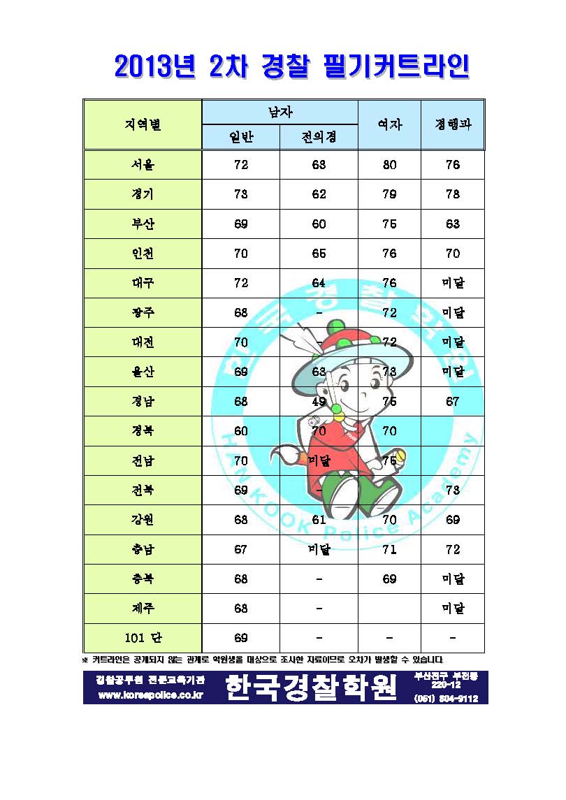 글제목 :      2013년 2차 경찰공무원 예상 필기커트라인