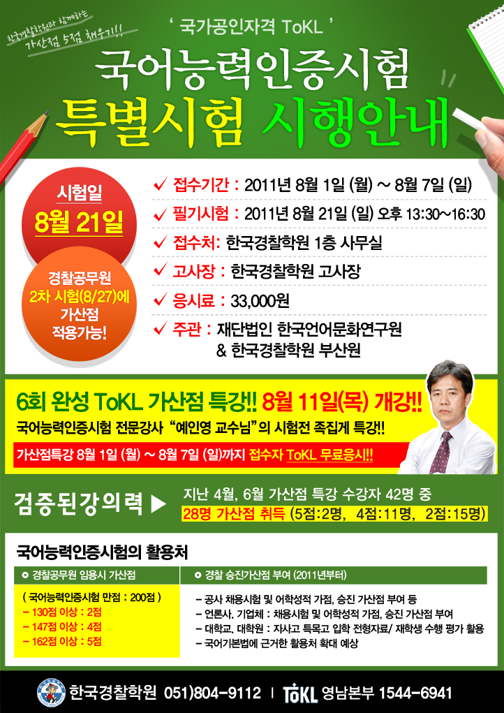 2011년 8월 21일(일) 국어능력인증시험(ToKL) 시행 안내입니다. |