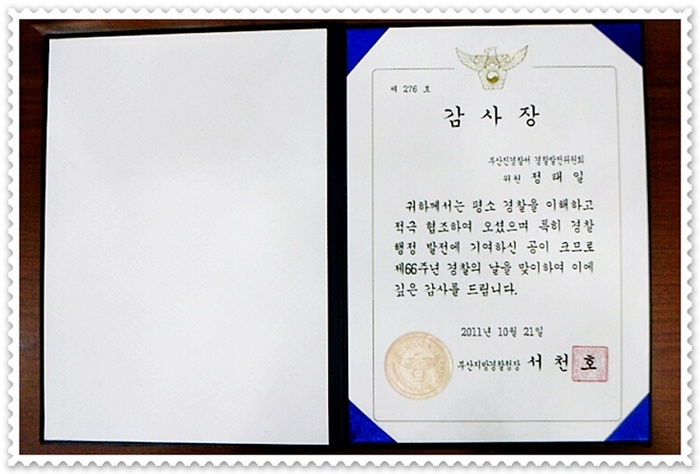부산지방경찰청에서 수여하는 감사장을 받게 되었습니다.