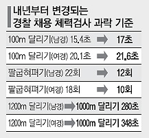 이에 따라 100m 달리기 과락기준의 경우 남경은 현행 15.4초에서 17초로, 여경은 20.1초에서 21.6초로 바뀌고, 팔굽혀펴기의 경우엔 남경은 현행 22회에서 12회로 여경은 18회에서 10회로 대폭 완화된다. 또 1200m 달리기는 과락자는 적었지만, 현직 경찰관과의 형평성 문제 때문에 1200m 달리기를 1000m 달리기로 종목을 바꾸고 시간기준도 남경 280초, 여경 348초 이상으로 바뀐다. 경찰청 관계자는 “한 종목에서 실력이 낮더라도 다른 종목에서 우수한 실력을 갖춘 응시생들이 떨어지는 것을 방지하고자 과락기준을 완화할 방침”이라고 말했다.