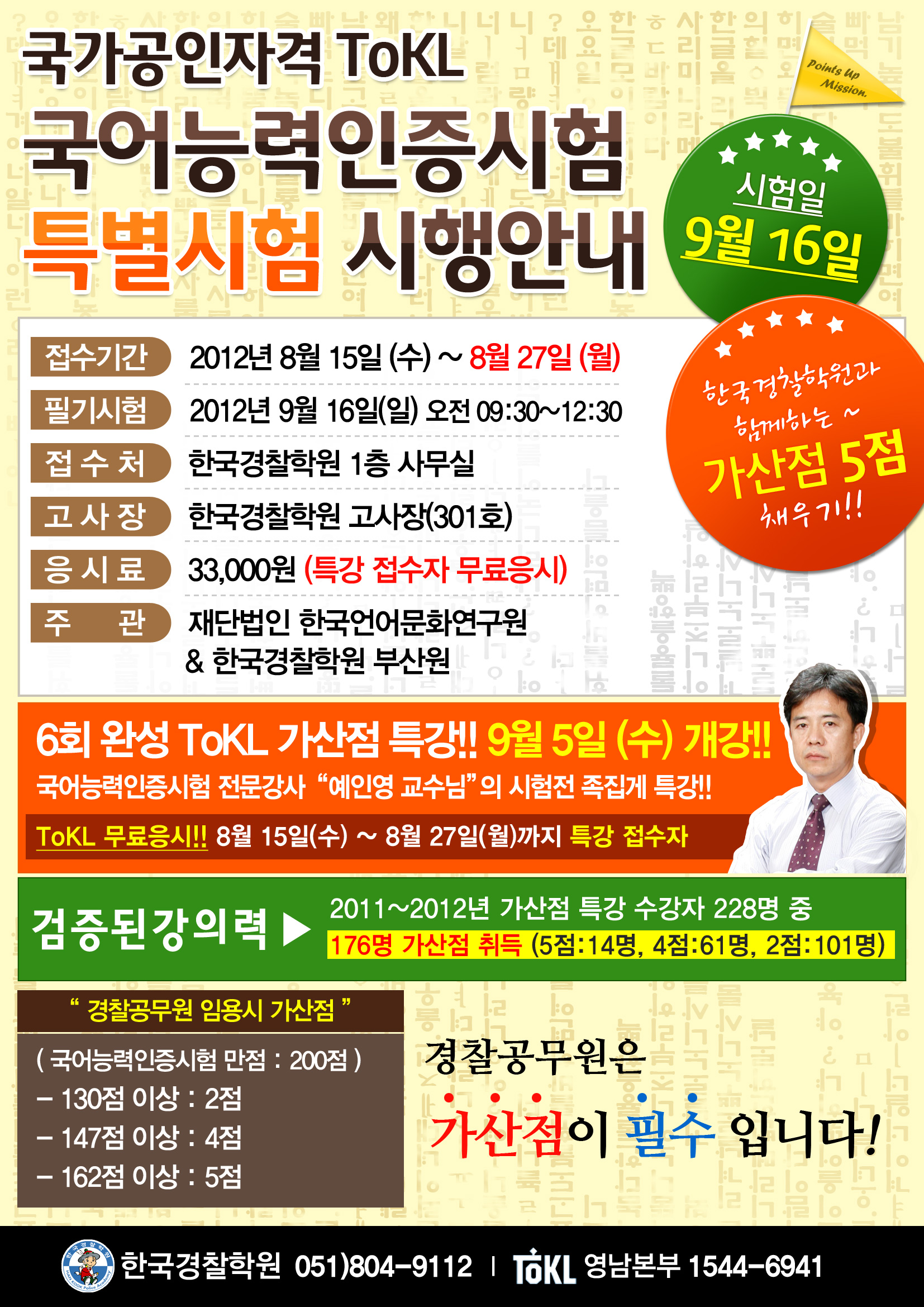 경찰공무원 가산점을 위한 국어능력인증시험을 한국경찰학원 고사장에서 시행합니다.