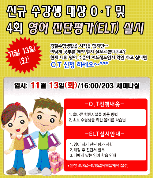 글제목 :      신규 수강생 대상 O/T 및 3회 영어진단평가(ELT) 실시