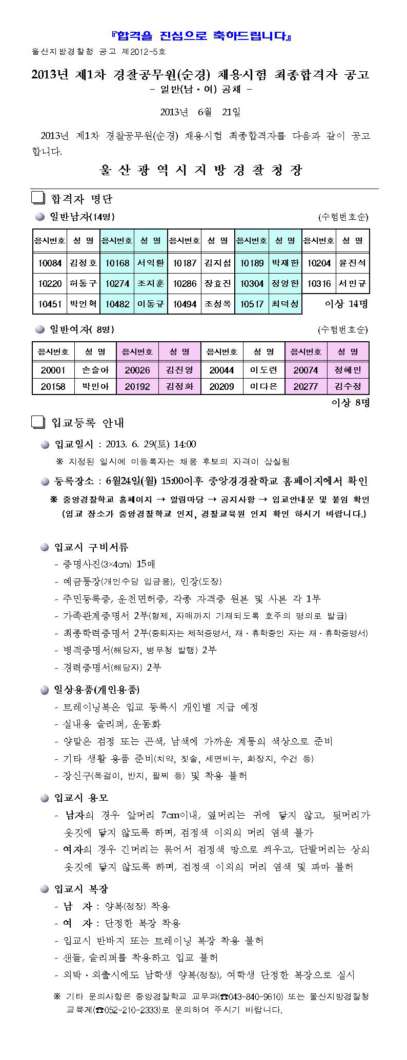 글제목 :      ★ 2013년 제1차 경찰채용 최종 합격자 ★