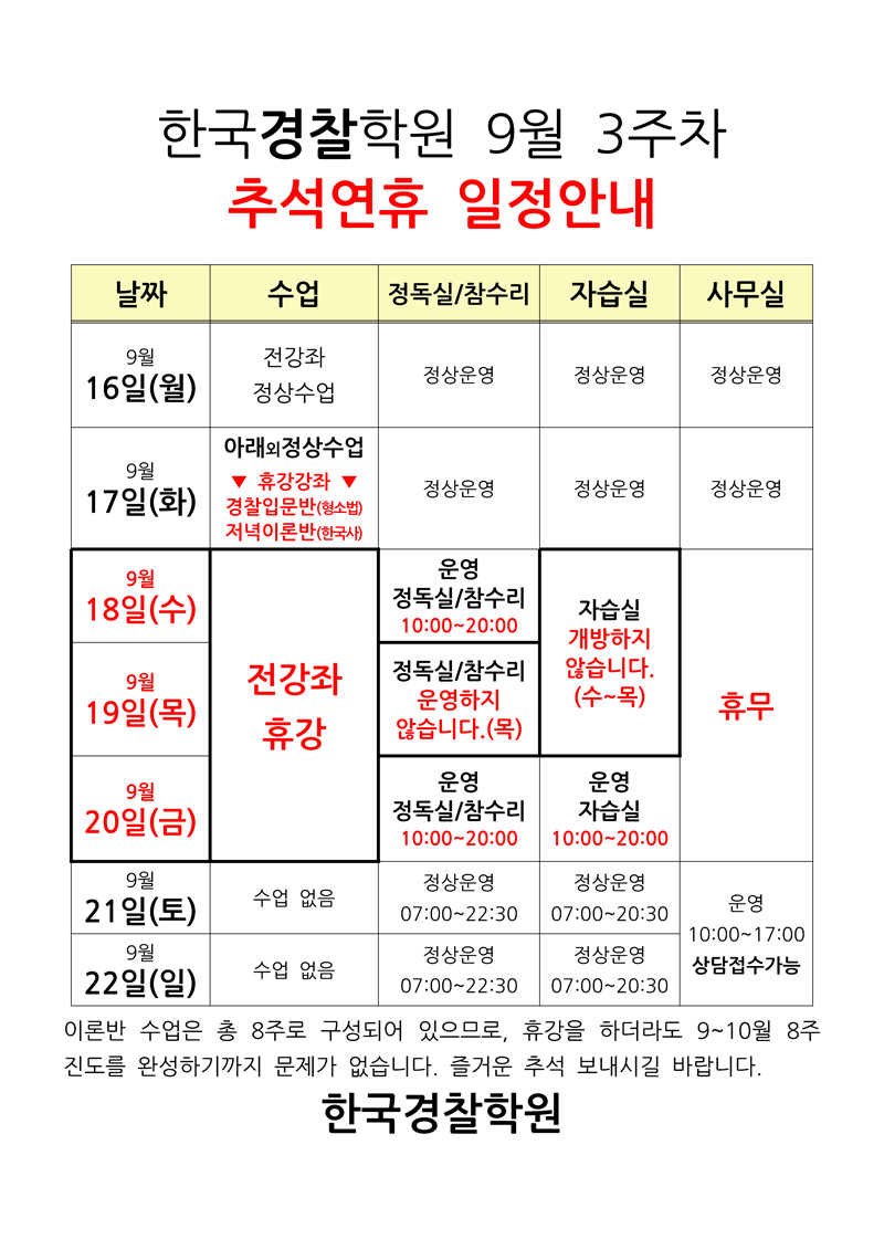 9월 3주차, 추석연휴 학원일정 안내입니다.