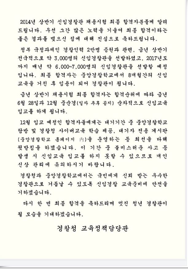 2014년 제1차 경찰공무원(순경) 채용 최종합격자를 붙임과 같이 공고합니다.