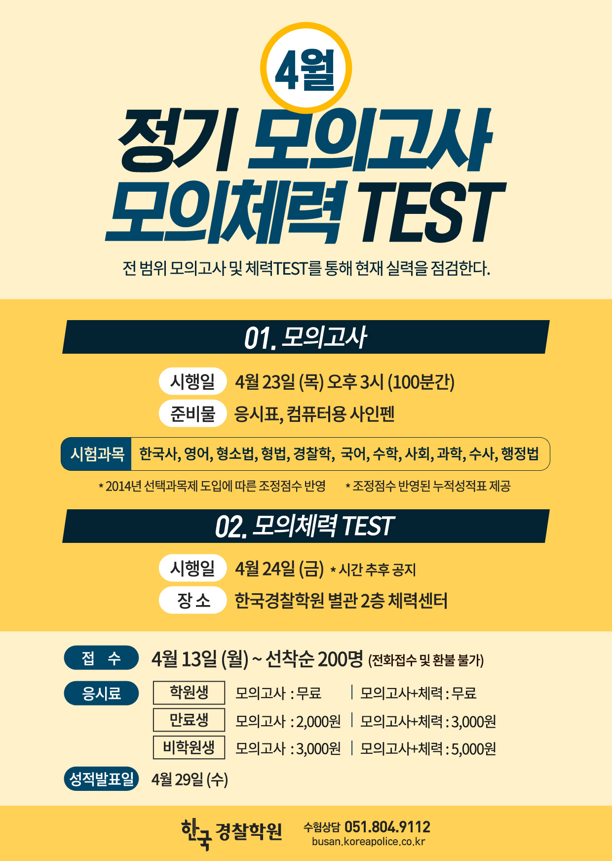 4월 모의고사 및 모의체력시험 접수 안내입니다.