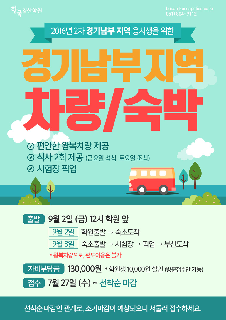 저희 한국경찰학원에서는 9월 3일 시행되는 일반순경(2차) 경기남부지방경찰청 필기시험에 응시하는 수험생 여러분의 이동 및 수험편의를 도모하기 위하여 다음과 같이 차량지원의 계획을 공지합니다.
