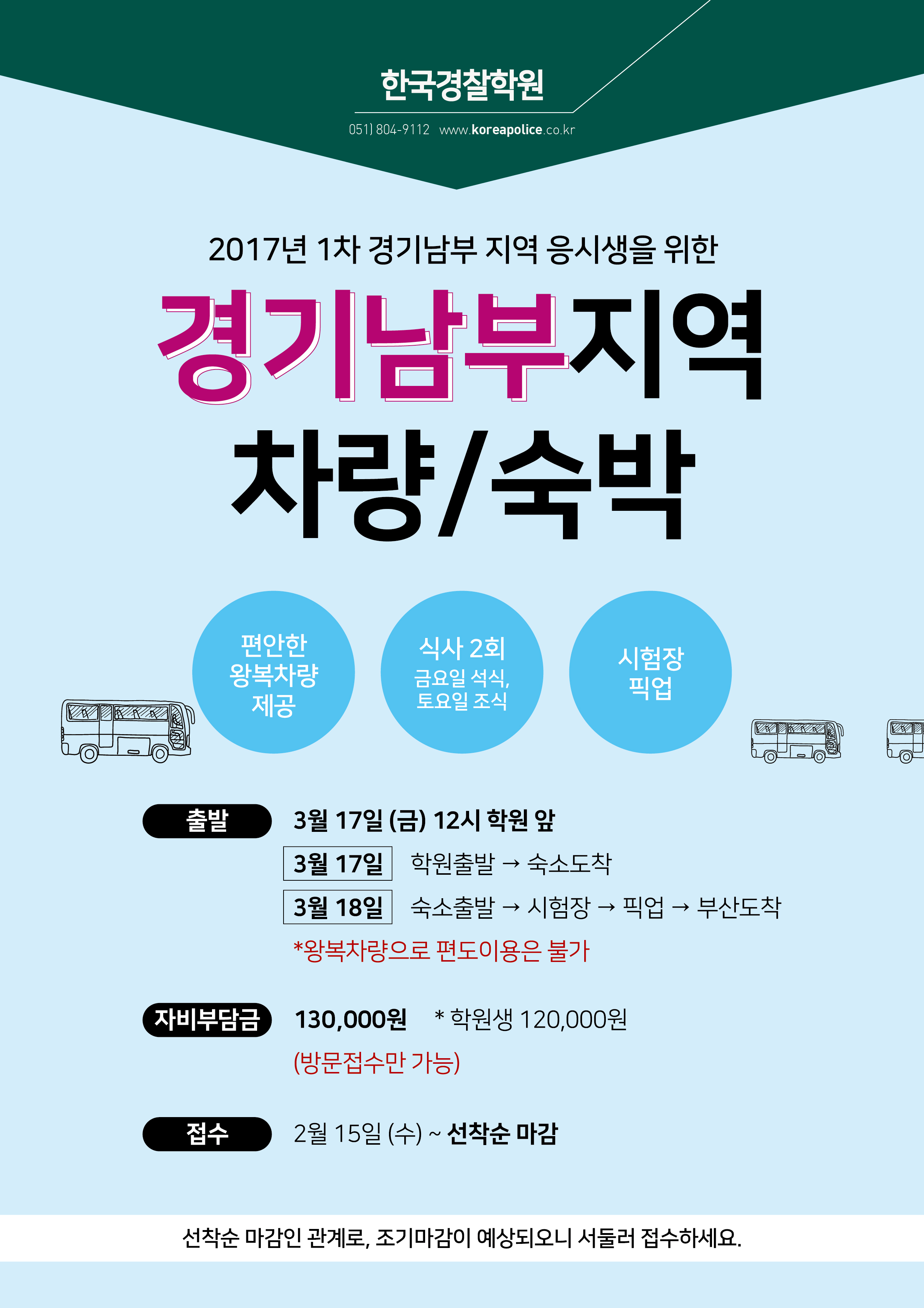 저희 한국경찰학원에서는 3월 18일 시행되는 일반순경(1차) 경기남부지방경찰청 필기시험에 응시하는 수험생 여러분의 이동 및 수험편의를 도모하기 위하여 다음과 같이 차량지원의 계획을 공지합니다.