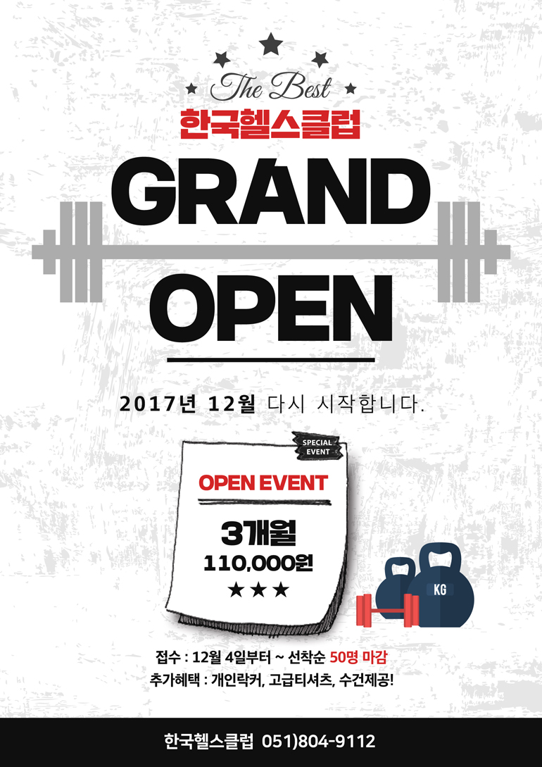글제목 :      한국헬스클럽 12월 OPEN EVENT (선착순 마감)