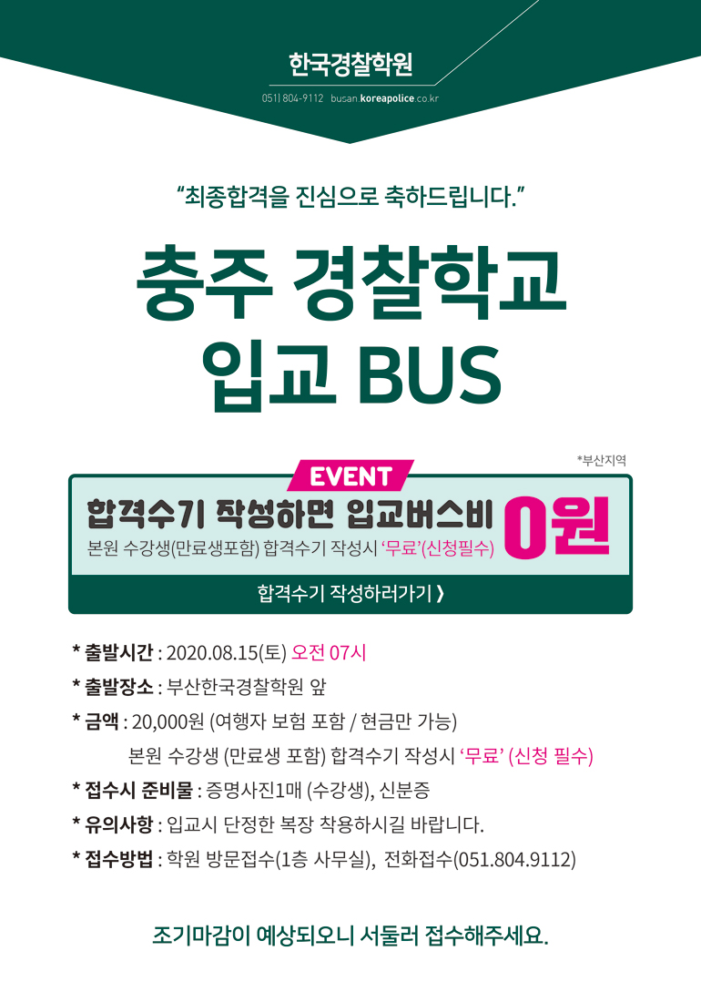 2020-1차 최종합격생 충주경찰학교 입교버스 안내입니다. 합격하신 분들 모두모두 축하합니다~~ 그동안 수고많으셨습니다