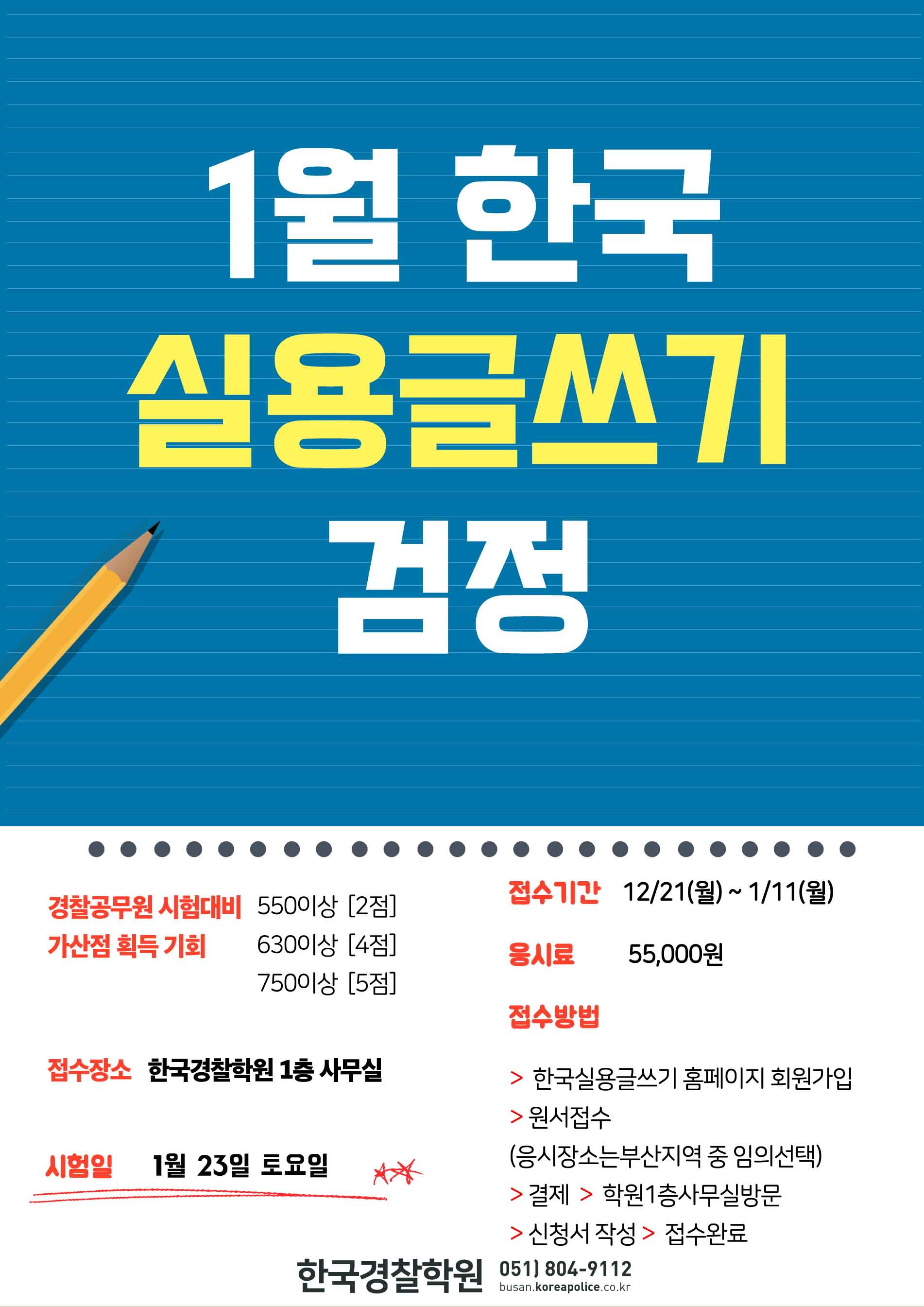 1월 23일 진행되는 한국실용글쓰기검정 시험접수를 한국경찰학원 1층 사무실에서 받습니다.