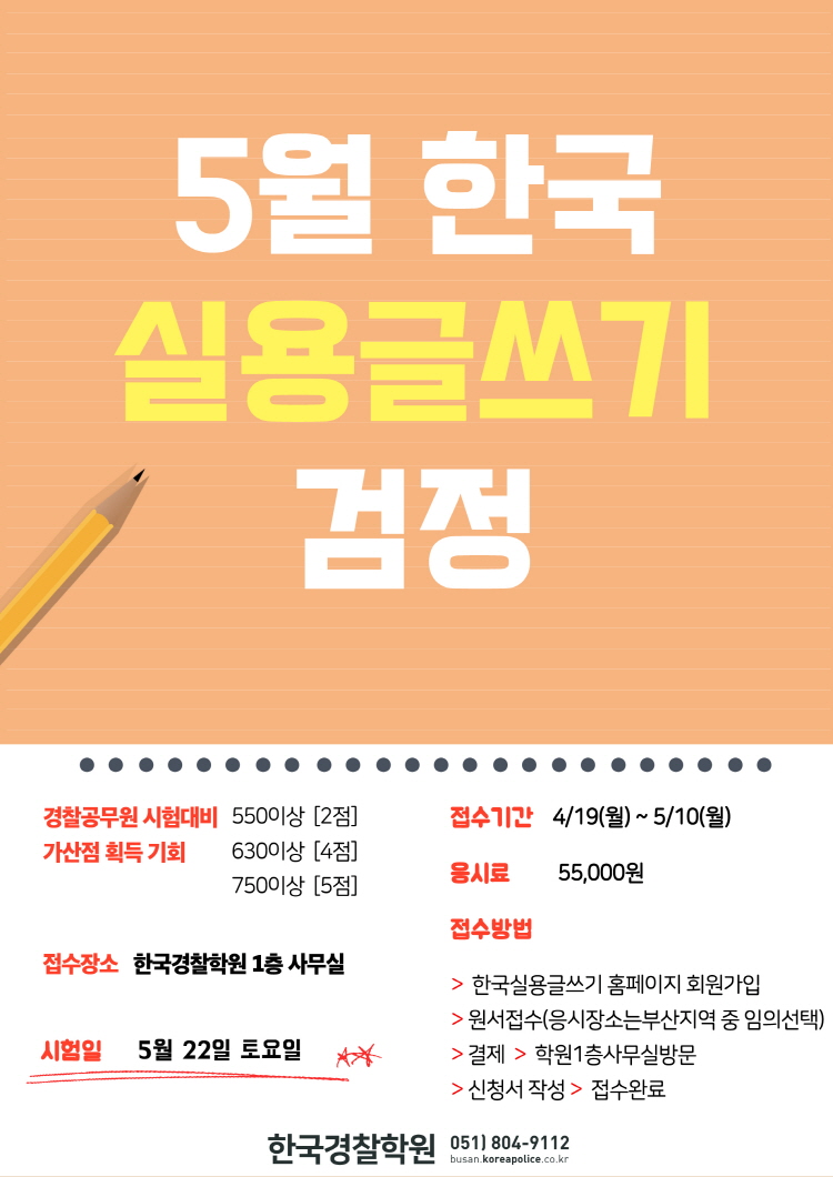 5/22(토) 진행되는 한국실용글쓰기검정 시험접수를 한국경찰학원 1층 사무실에서 받습니다.