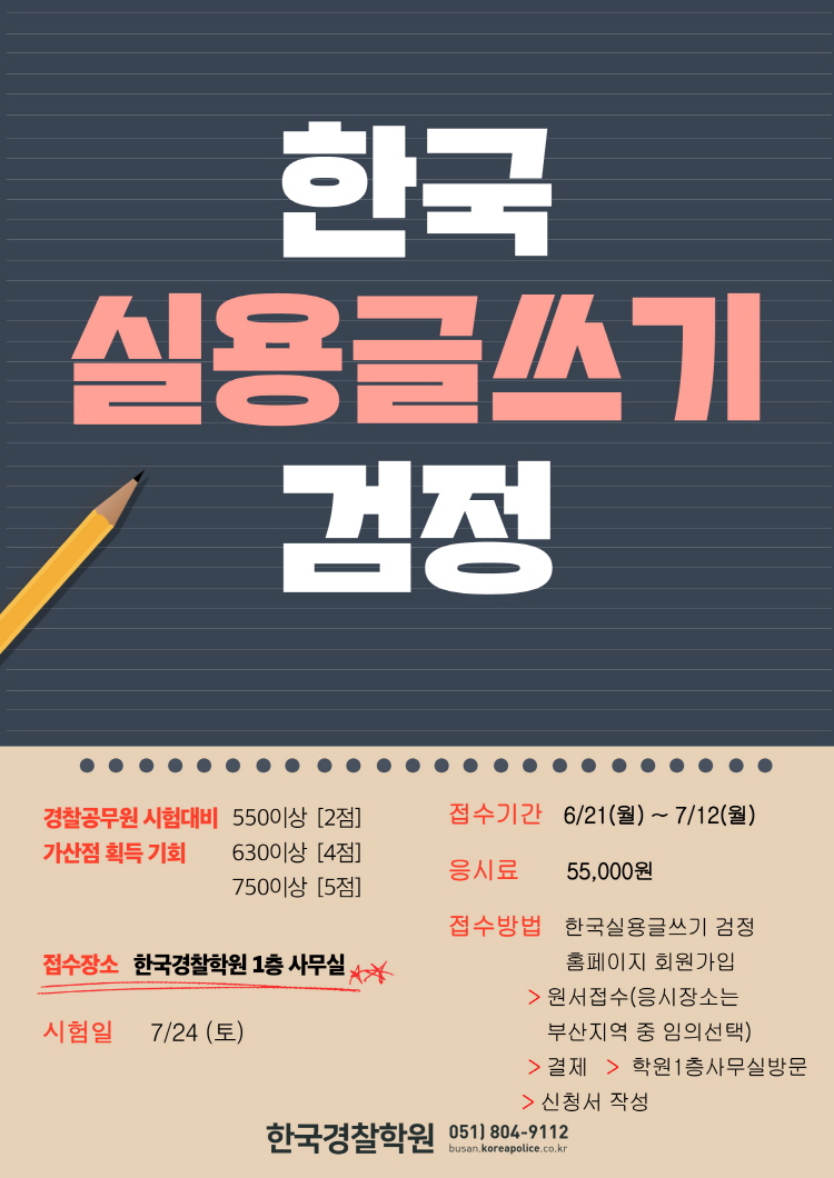 7/24(토) 진행되는 한국실용글쓰기검정 시험접수를 한국경찰학원 1층 사무실에서 받습니다.