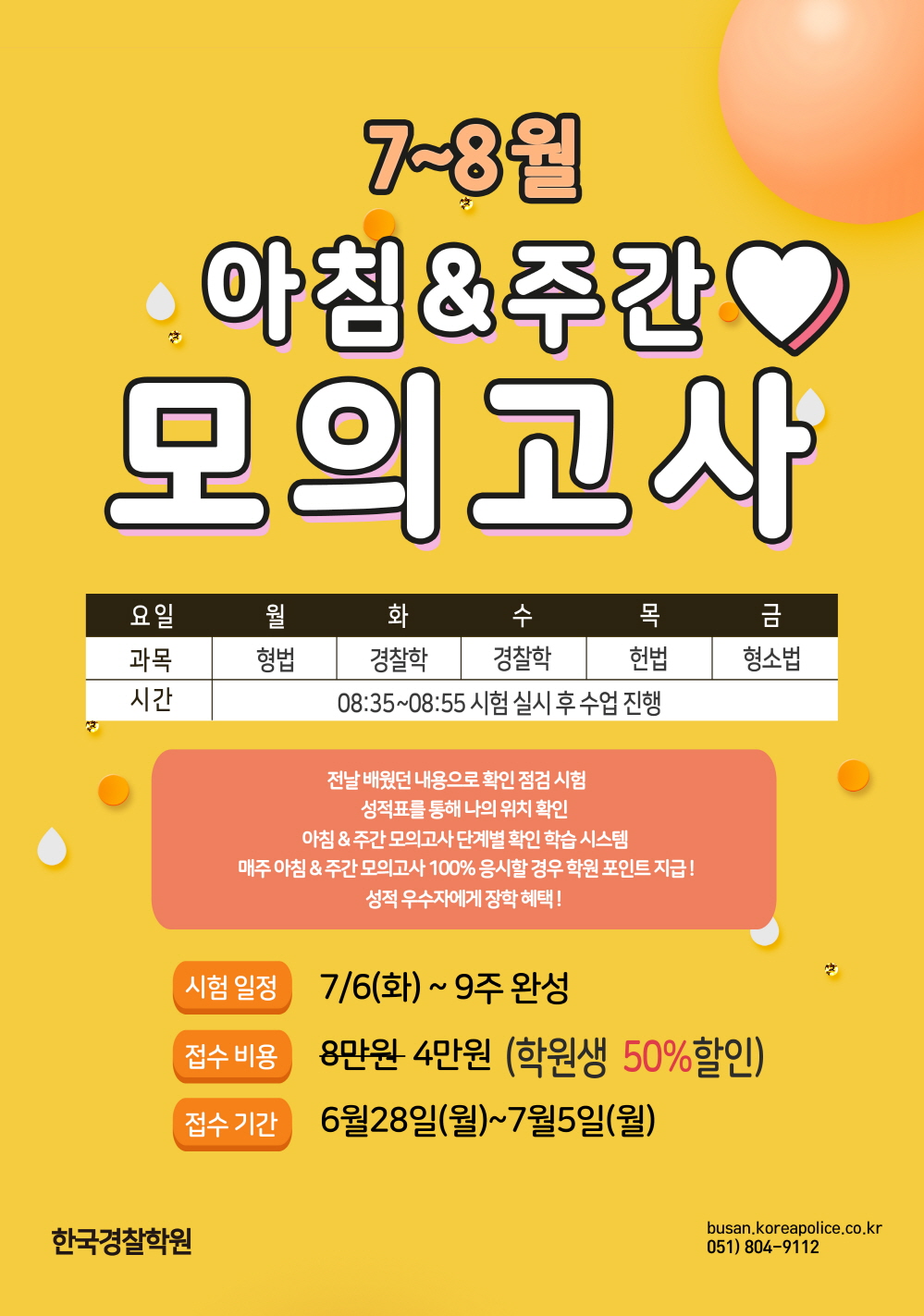 - 시험과목 : 경찰학(월), 경찰학(화), 헌법, 형사소송법, 형법