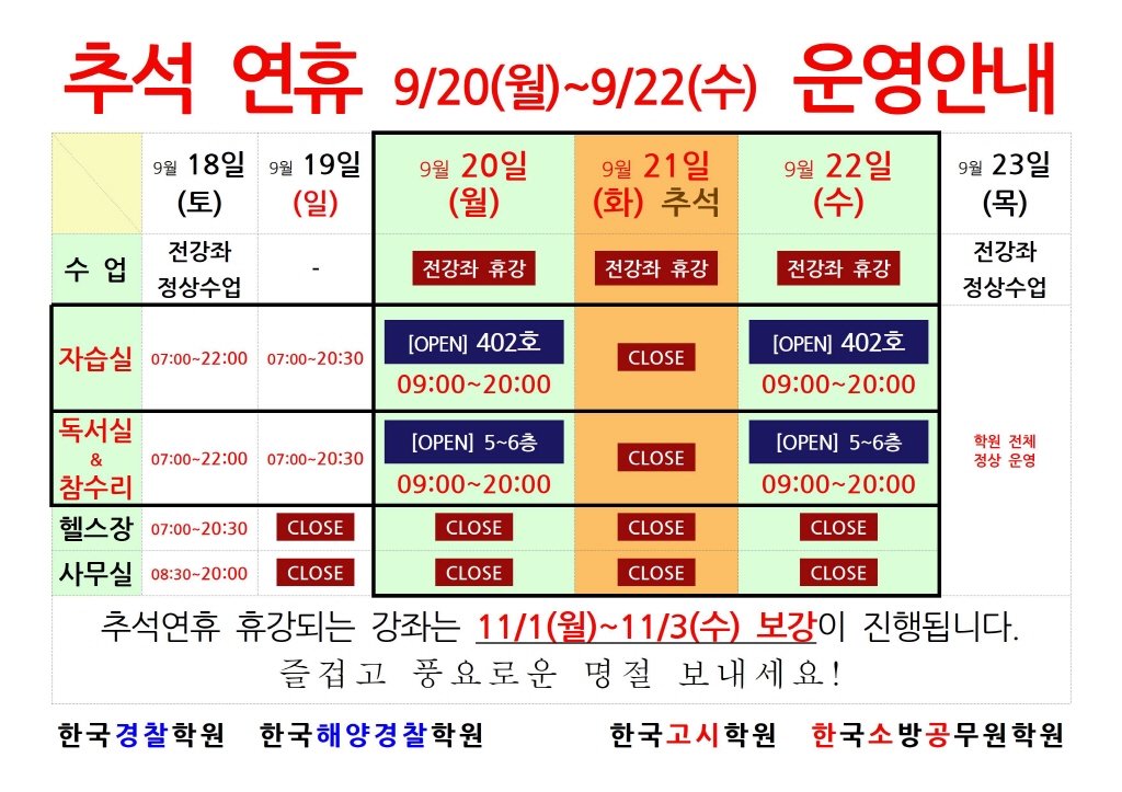 추석연휴 학원운영일정안내