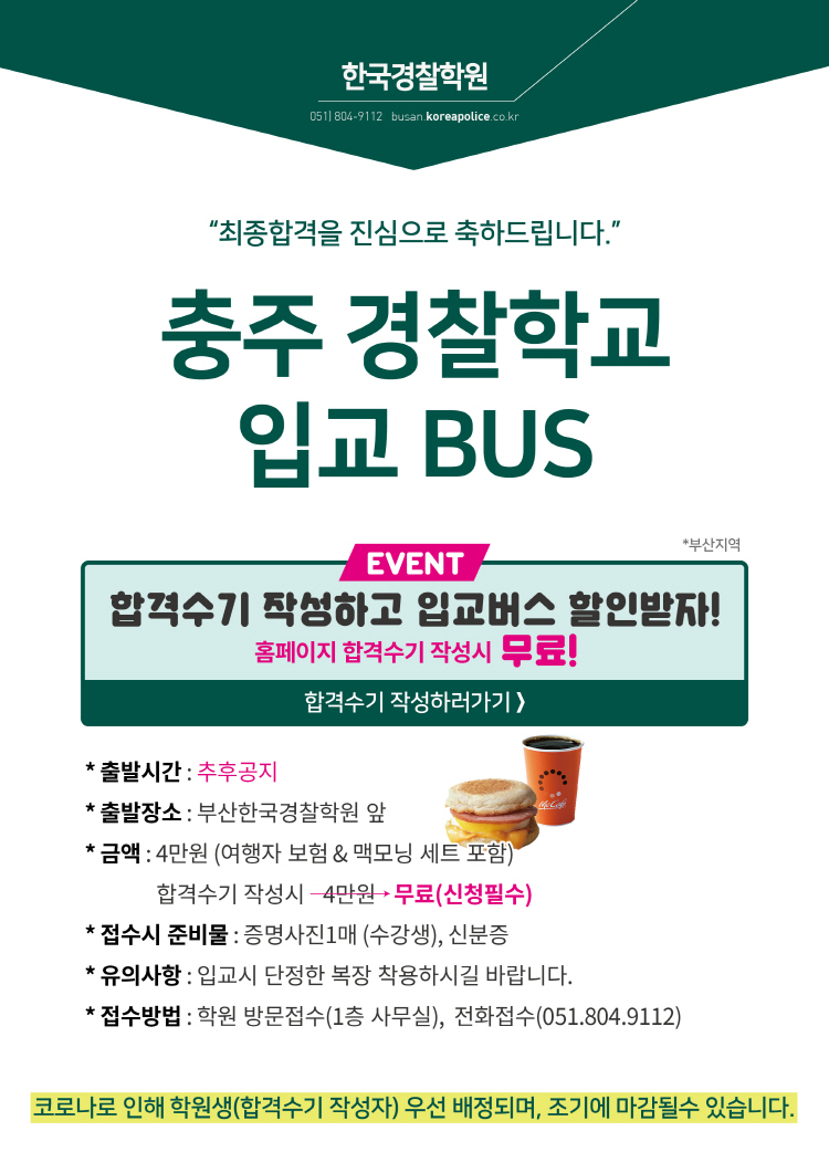 2021-2차 최종합격생 충주경찰학교 입교버스 안내입니다. 합격하신 분들 모두모두 축하합니다~~ 그동안 수고많으셨습니다