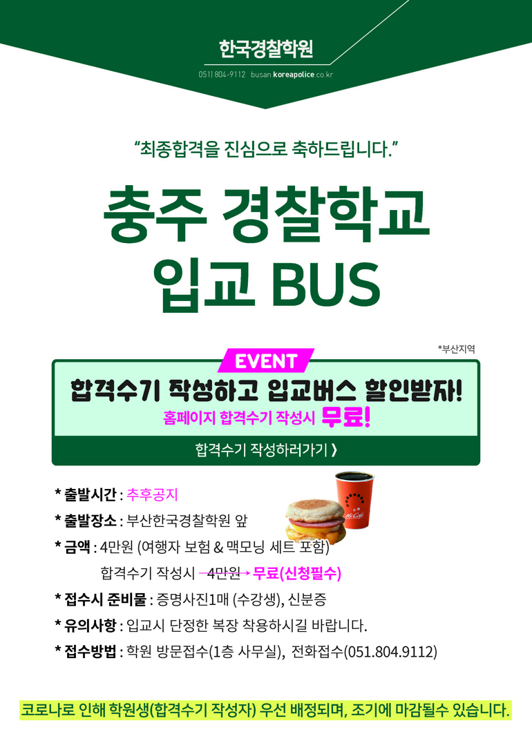 2022-1차 최종합격생 입교버스 안내입니다. 합격하신 분들 모두모두 축하합니다~~ 그동안 수고많으셨습니다