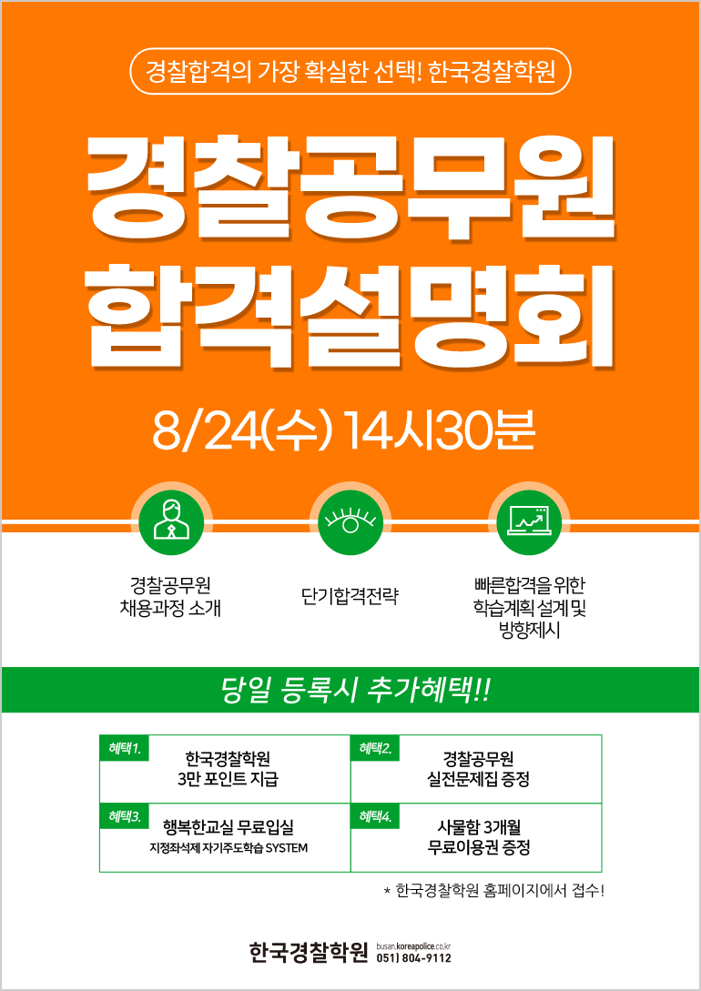 [안내] 부산 한국경찰학원 경찰공무원합격 설명회(8월24일 수요일 오후 14시30분) 개편과목 합격전략 및 빠른합격을 위한 공부방법 제시당일등록으로 추가혜택도 받으세요!