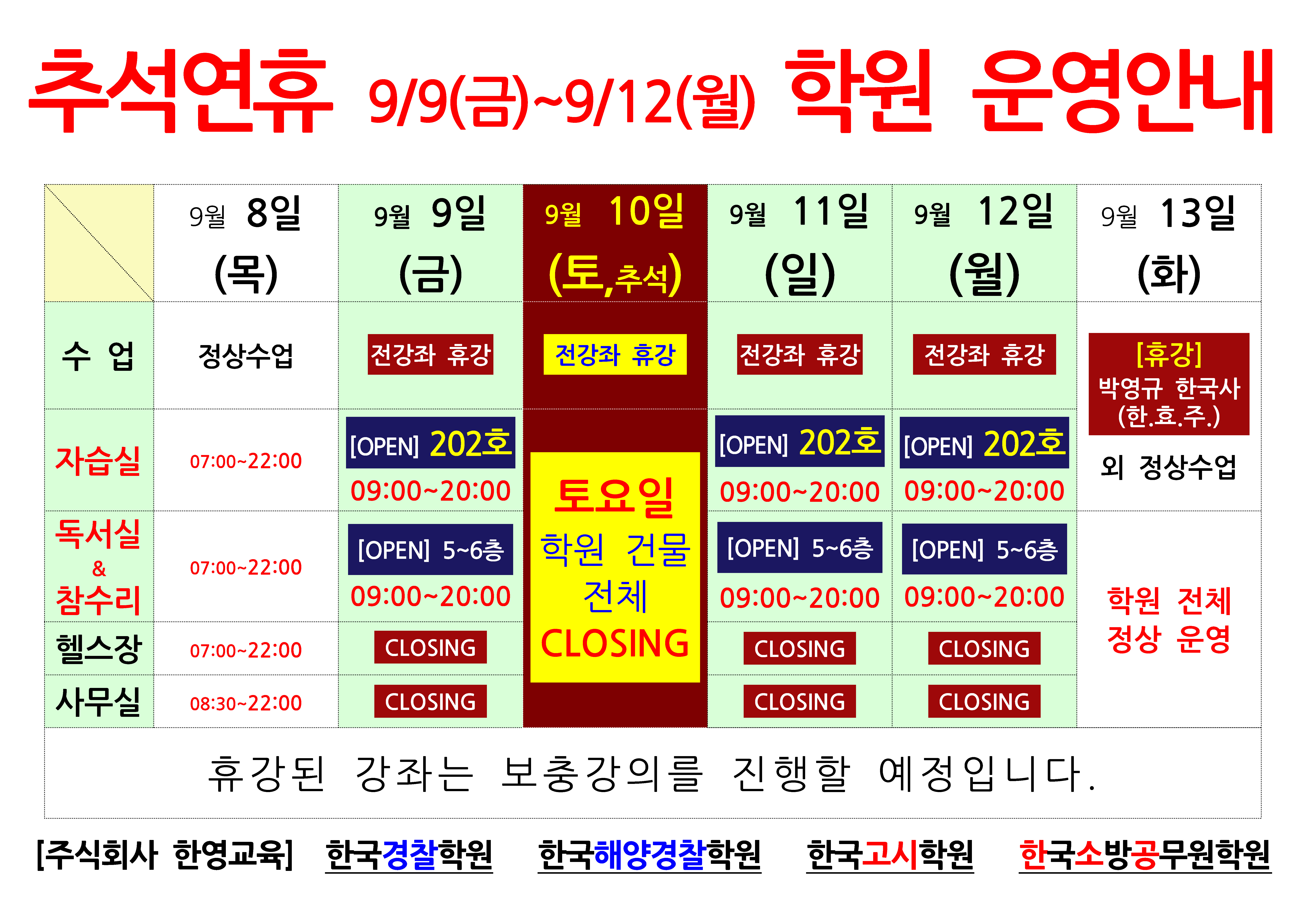 ★추석연휴 학원운영안내 (강의,자습실,정독실등)★