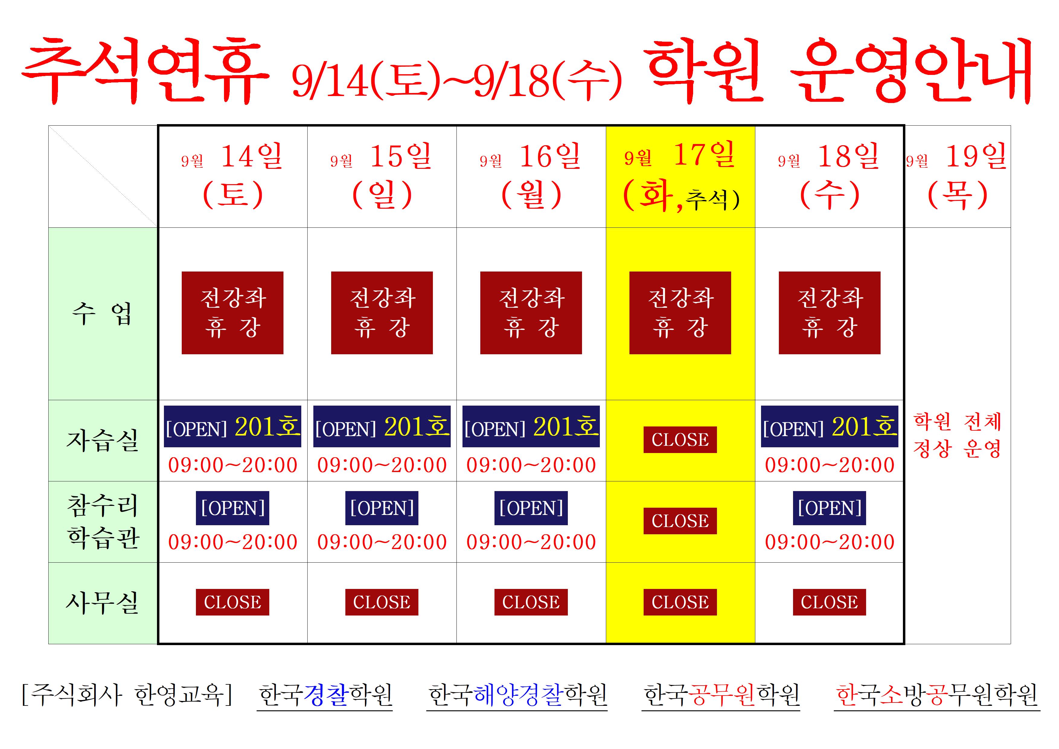 글제목 :      한국경찰학원 추석 연휴 일정 안내