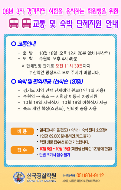글제목 :      08년 3차 경기지역 교통 및 숙박 지원 안내