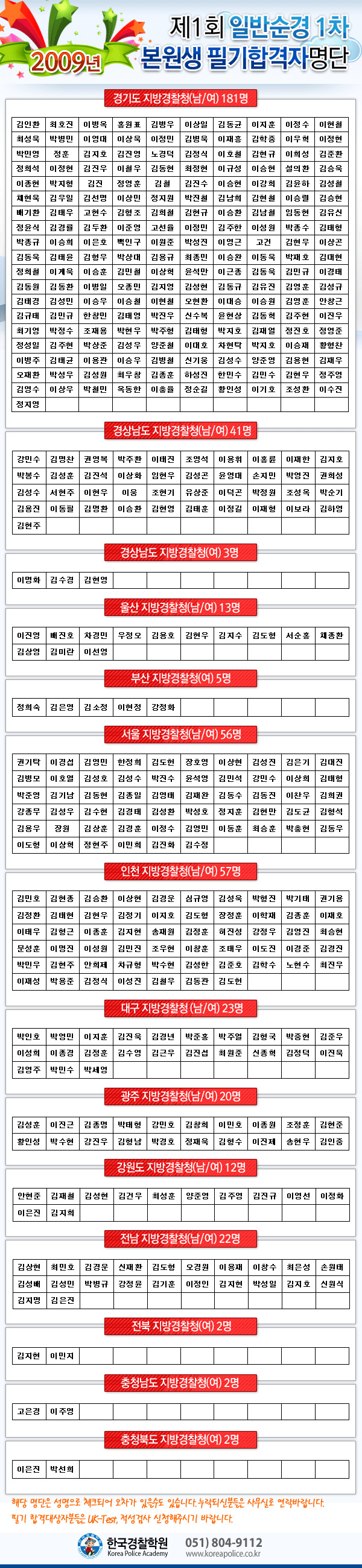 글제목 :      ★☆ 2009년 제1차 경찰공무원(순경) 채용시험 본원출신 필기합격자☆★