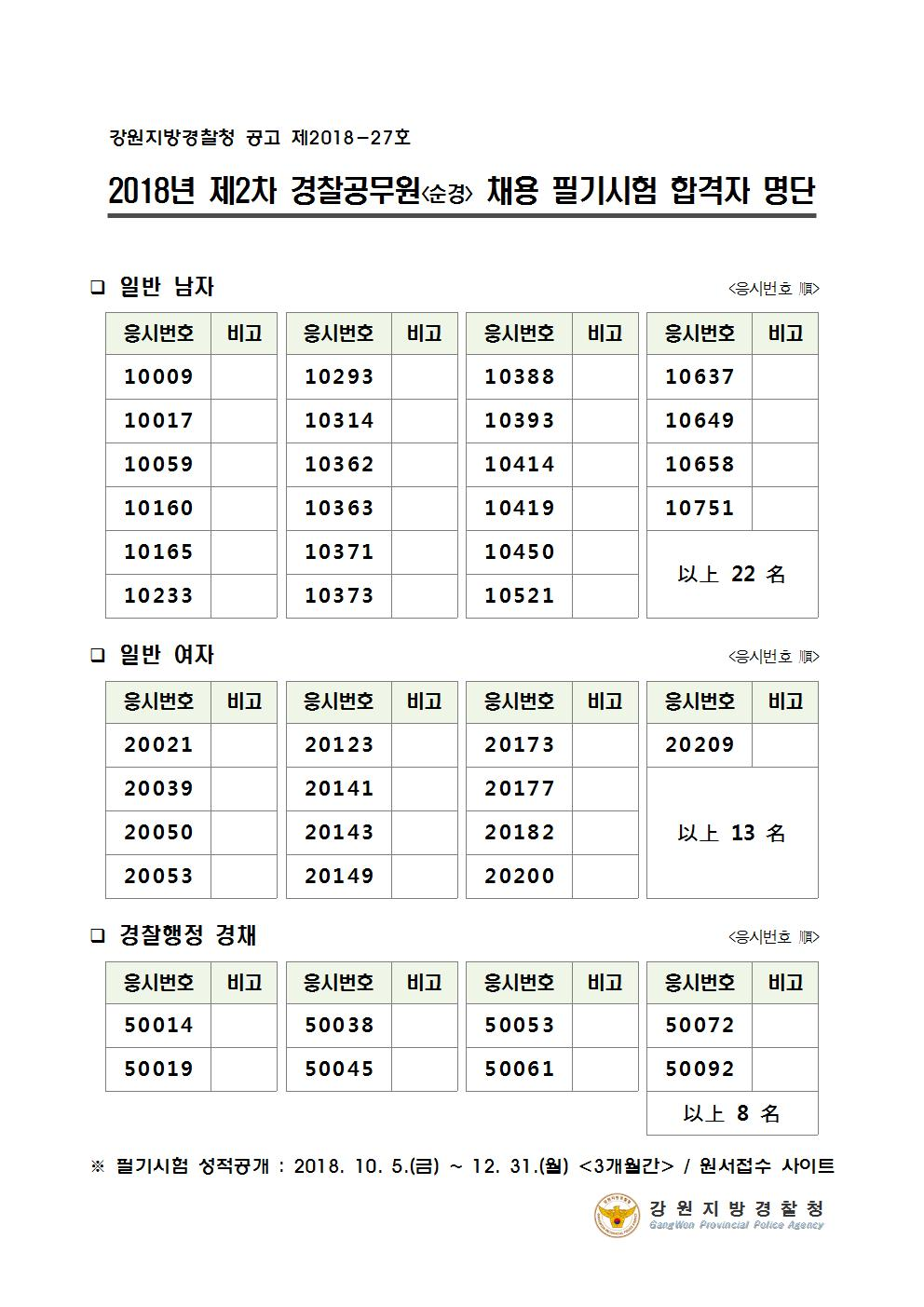 2018년 제2차 경찰공무원(순경) 채용 필기시험 합격자 |