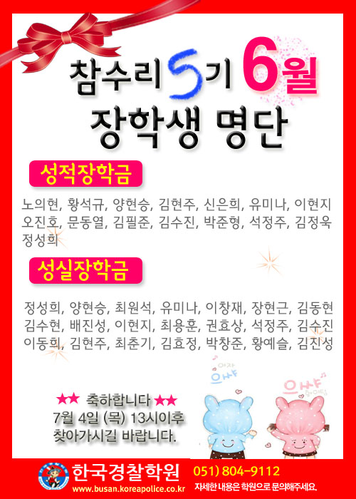 글제목 :      [축하합니다.^^] 참수리 N5기 6월 장학생