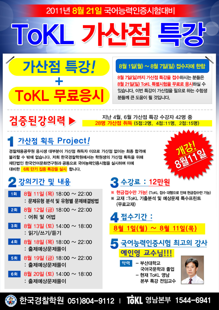 글제목 :      [국어능력인증시험] 8월 21일(일) 시험대비 가산점 특강
