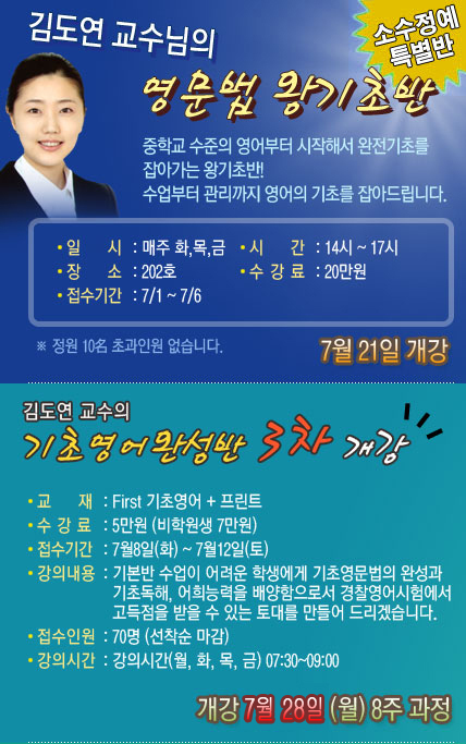 글제목 :      08년 7월 기초영어완성반(김도연교수)3차 개강 안내