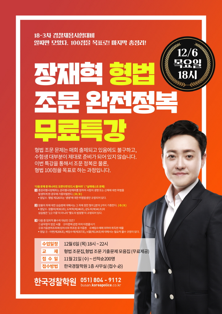 글제목 :      [무료특강] 장재혁 형법 조문 완전정복 무료특강 (12/6)