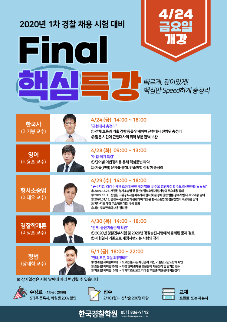 글제목 :      [특강] 2020-1차대비 Final 핵심 특강 4/24(금) 개강!