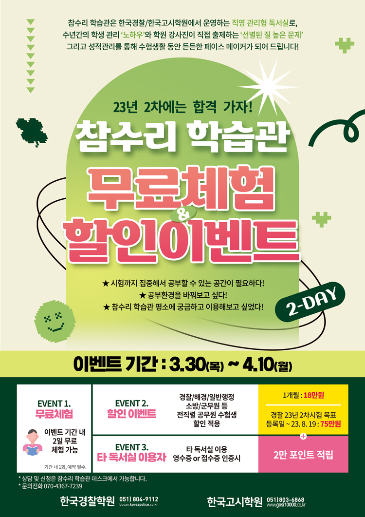 [관리형독서실] 참수리학습관 23-2차 경찰 합격기원 무료체험 & 할인이벤트 |