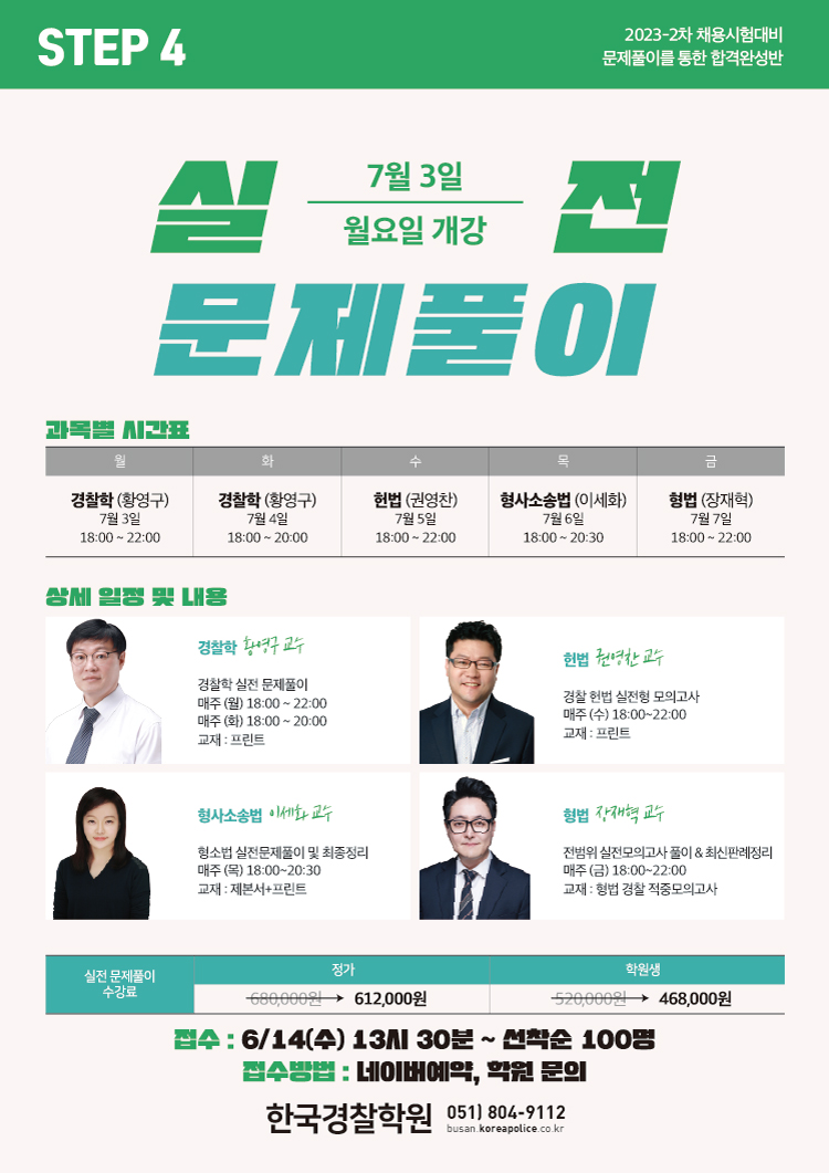 ● 방법 : 네이버 검색창에 - "한국경찰학원 부산원" 검색 - 예약 클릭 - STEP4 실전문풀 지정석을 위한 순번 접수 클릭 - 6/14(수) 13:10 선택 - 이름+연락처 입력 => 예약 완료