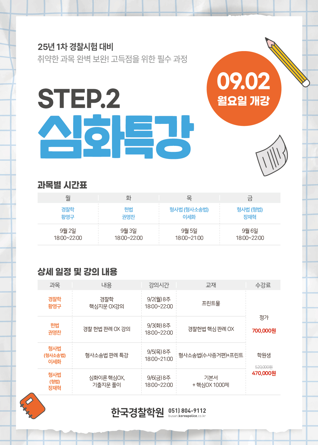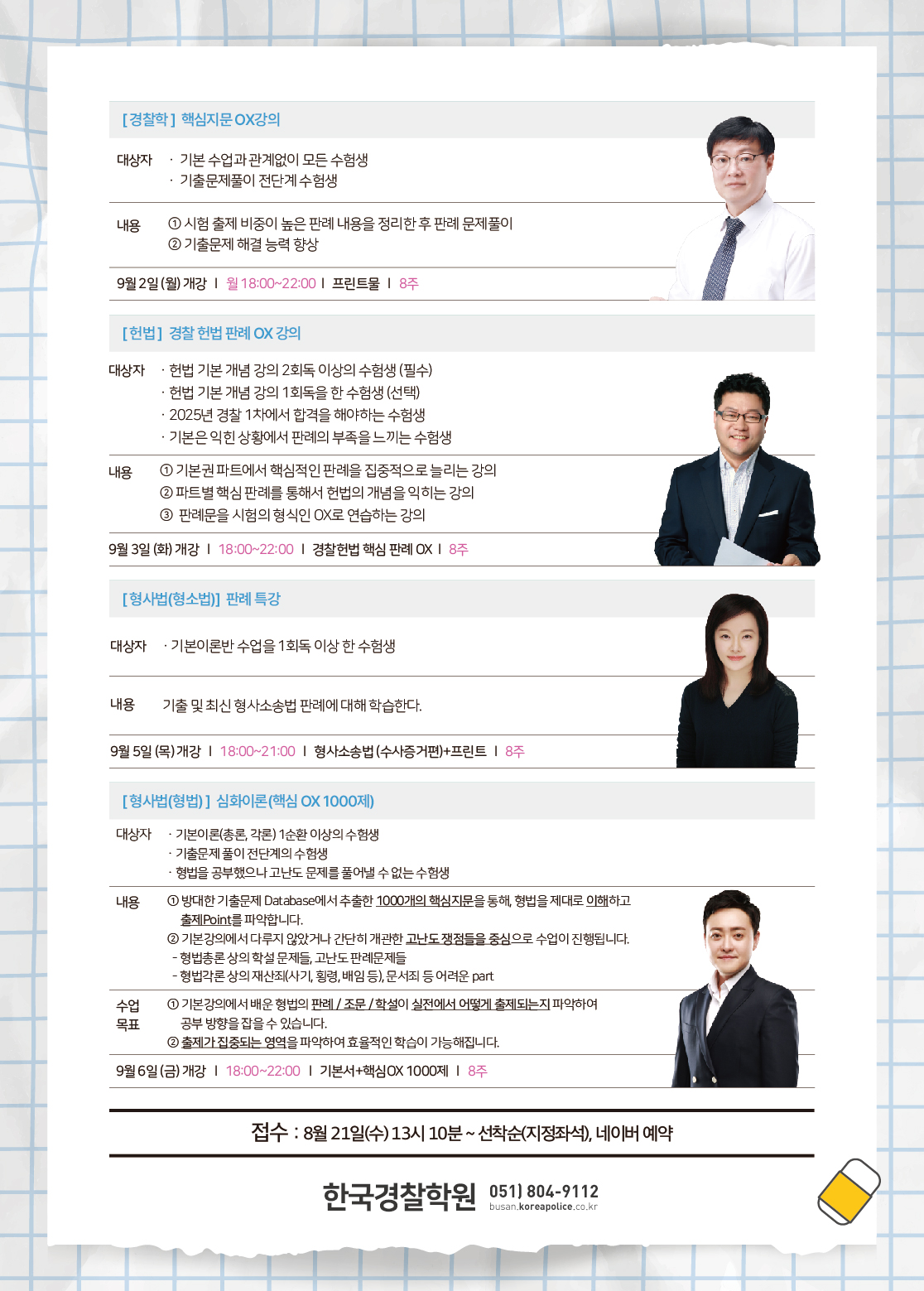 * 방법 : 네이버 "한국경찰학원 부산원" 검색 - 예약 - STEP2 심화특강 지정석을 위한 순번 접수 - 8/21(수) 13:10 선택 - 이름+연락처 입력 => 예약 완료