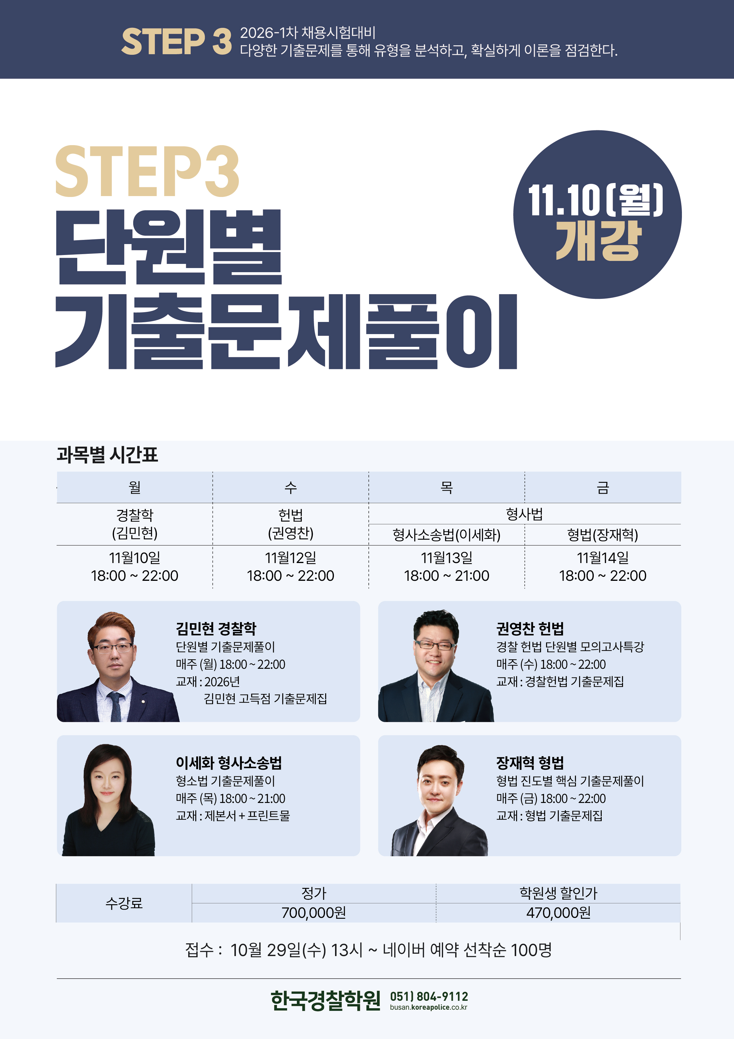 * 방법 : 네이버 "한국경찰학원 부산원" 검색 - 예약 - STET3 특강 지정석을 위한 순번 접수 - 10/29(수) 13:00 선택 - 이름+연락처 입력 => 예약 완료