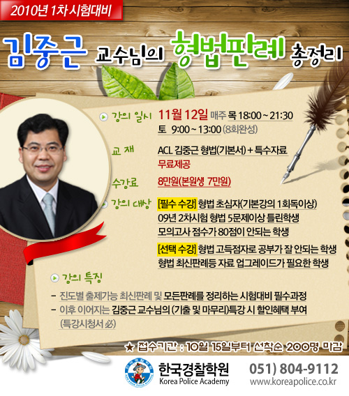 경찰형법시험의 출제방식의 변화로 매번 실전시험에서 그 효과로 입증된 김중근 교수님의 형법판례특강 수업을 통해 수험생여러분의 합격이 하루라도 더 빨라지는 계기가 되시길 바랍니다.